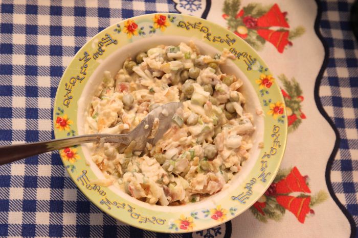 Салат заправить майонезом (или сметаной), при необходимости посолить.