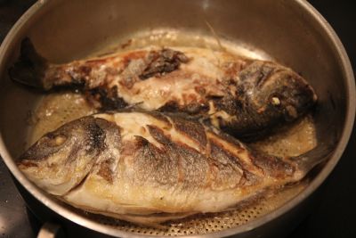 Предварительно разогреваем оливковое масло на сковороде (на среднем огне, чтоб не начало гореть), затем выкладываем рыбу. Обжариваем сначала с одной стороны.