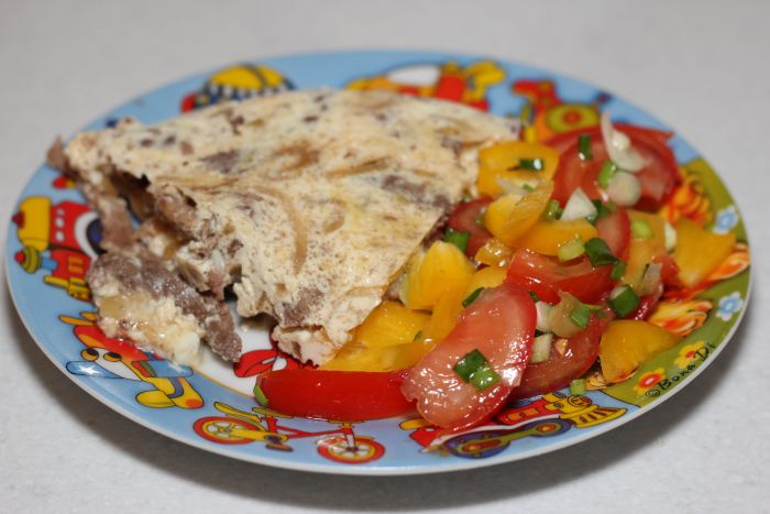 Яйца и молоко перемешать вилкой и посолить. Залить яичной смесью мясо, так чтоб оно было полность покрыто.