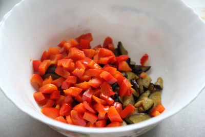 Затем нарезаем перец небольшими кубиками и также обжариваем на сильном огне на оливковом масле — достаточно 3 минут.