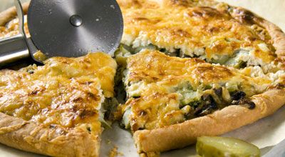 На сочень выложите грибную начинку, на неё зелень, нарезанный кружочками огурец. Полейте сметаной, взбитой с яйцами, посыпьте тёртым сыром и запекайте в духовке 40 минут.