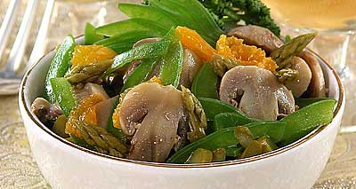 Отварить грибы. Перец нарезать соломкой, грибы - ломтиками, спаржу - кусочками, мандарины очистить и нарезать ломтиками. Для салатной заправки взбить масло, уксус, соль. Перец, грибы, спаржу, мандарины соединить, заправить, выложить в салатник и оформить зеленью.