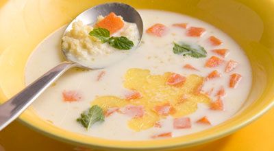 При подаче разлейте по тарелкам, добавьте по кусочку масла и оформите листиками мяты.