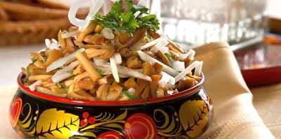 Грибы нарежьте кубиками, лук - полукольцами. Яблоко натрите на крупной тёрке. Подготовленные ингредиенты соедините, заправьте маслом, посолите, поперчите, перемешайте и выложите в салатник.