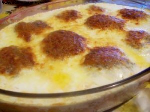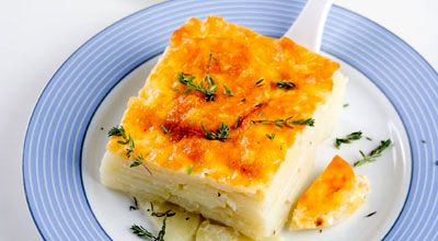 Картофель очистить и нарезать кружочками толщиной 0,5 сантиметра. Репчатый лук нарезать кубиками. В форму для запекания выложить картофель и лук слоями, верхний слой - картофель, посыпая каждый солью и перцем по вкусу. Залить молоком и посыпать сыром.