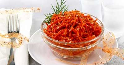 Морковь нашинкуйте соломкой или натрите на специальной тёрке, посолите, выдержите 30 минут, сок слейте. Лук нарежьте колечками, обжарьте на масле до золотистого цвета, охладите и соедините с морковью. Чеснок пропустите через пресс, соедините с чёрным и красным перцем, кориандром, кунжутом, сахаром и лимонным соком. Тщательно перемешайте с морковью и луком, дайте настояться.