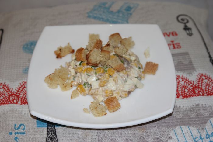 Подавать салат лучше порционно, присыпав сухариками. Дополнительно сухарики сложите в вазочку и поставьте на стол и любой гость сможет добавить их себе по вкусу в тарелку.