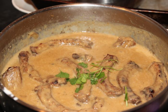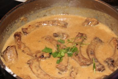 Для этого ребрышки опять перекладываем в отдельную посуду, а в подливу добавляем муку и сливки. Провариваем минут 10, а затем взбиваем блендером или растираем вилкой наш соус.