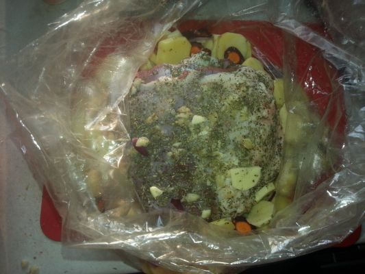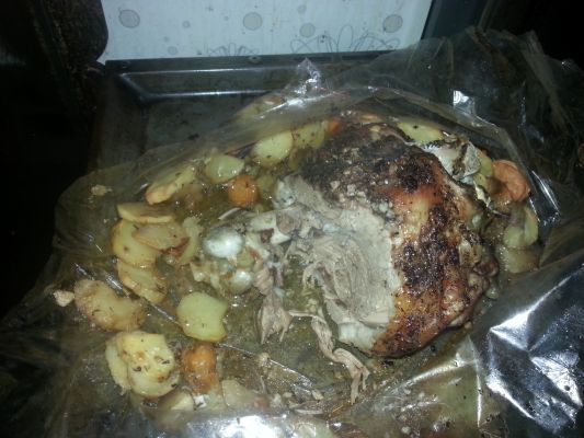 Убираем пакет в разогретую духовку на нижний уровень на 1,5-2 часа. Температура 180-200 градусов. Баранина готова. Мясо получилось сочным и нежным (брашек был молоденький).