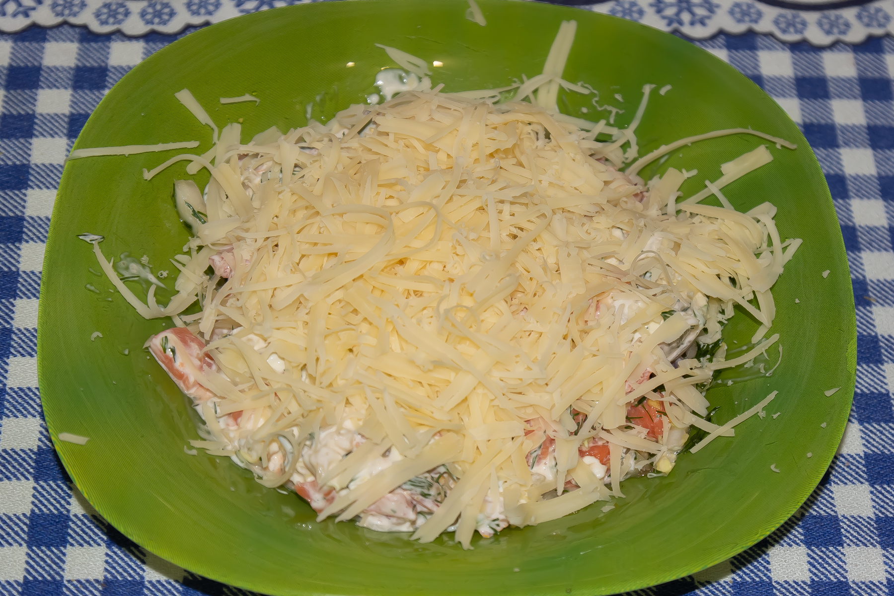 но помельче чем капусту, смешать и заправить майонезом. Сверху хорошо посыпать сыром и не перемешивать.