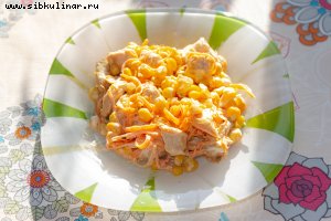 Нарезать куриное мясо кубиками и добавить его в салатник, все снова перемешать.