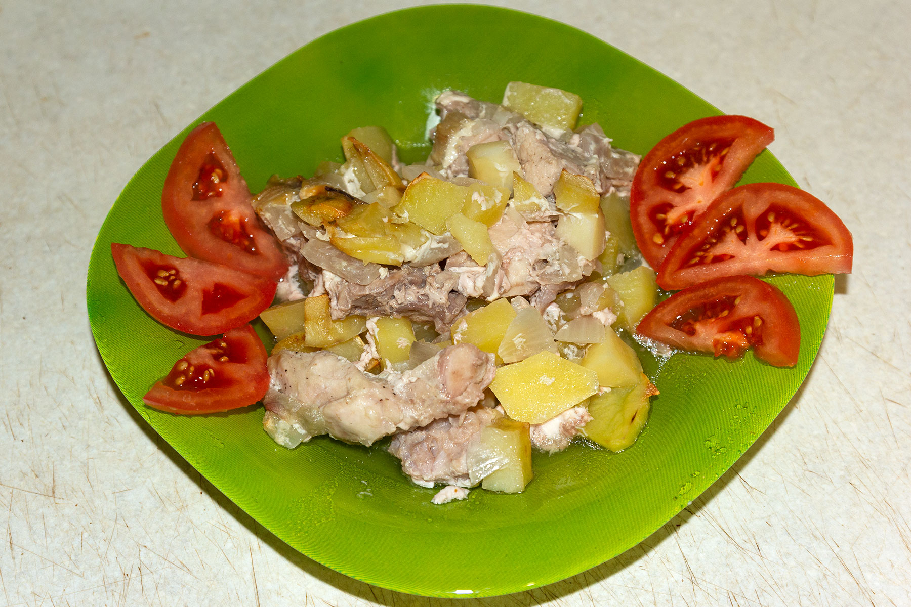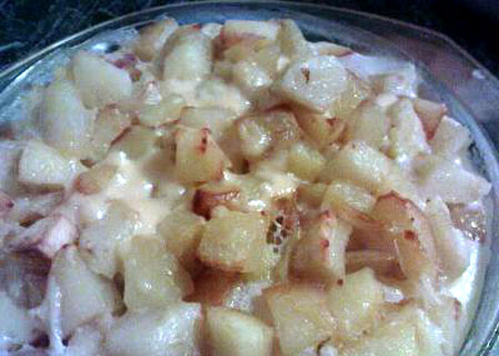 Соединить воду и молоко. Посолить. Поперчить. Перемешать. Полученную жидкость влить в сковороду так, чтобы жидкость на 1,5-2 см. была ниже верхнего слоя картофеля.