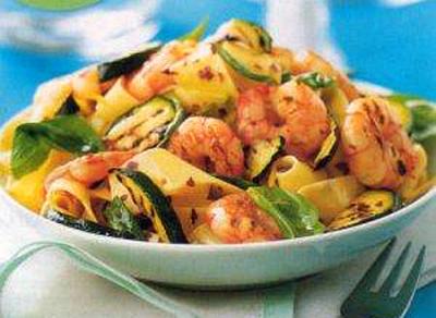В лапшу выложить креветки с кабачками. Масло соединить с чили, тщательно перемешать и влить в лапшу.