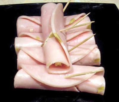 Ветчину нарезать ломтиками. Хрен соединить со сливками. Огурцы нарезать соломкой. Ветчину намазать хреном, выложить в центр огуречную соломку и завернуть в рулетики.