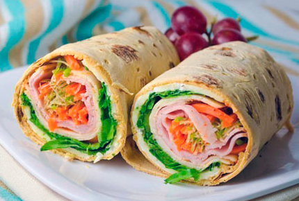 Лаваш разложить на стол и смазать сливочным сыром. Сверху положить лист салата, капусту, морковь, помидор, ветчину и курицу. Аккуратно свернуть и подать на стол.