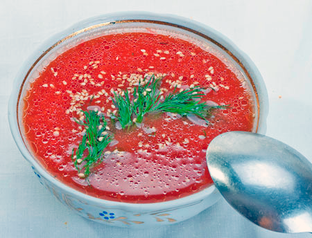 Измельчаем с помощью блендера томаты "Пилате" и добавляем их в рыбный бульон после его закипания вместе с приправой "кимчи".