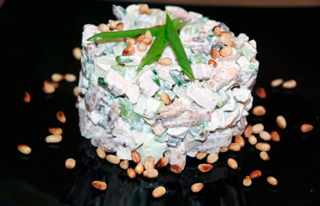 Соединить курицу, грибы, сельдерей, яблоко и лук. Перемешать. Залить заправкой. Разложить по порциям и подать на стол, украсив кедровым орехом.