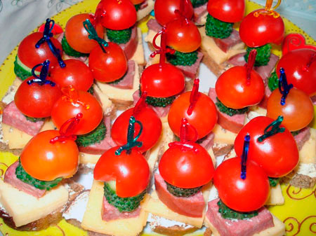 Помидорки помыть, разрезать пополам и нанизать на шпажки.