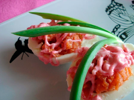 Приготовленным соусом полить нафаршированные яйца. Украсить зеленым луком и подать на стол.