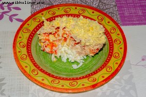 Говядину помыть, отварить и нарезать мелкими кубиками. Картофель отварить в мундире, почистить и нарезать небольшими кубиками. Морковь отварить, почистить и нарезать кубиками. Соленые огурцы очистить от кожуры и нарезать кубиками. Репчатый лук измельчить. Яблоко помыть, удалить сердцевину с косточками и натереть на крупной терке. Яйца отварить вкрутую и нарезать кубиками.