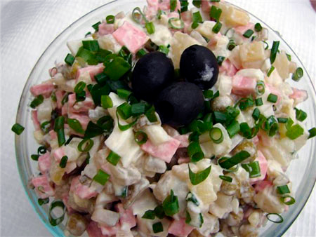 Вареная колбаса, Картофель, Огурцы соленые, горошек консервированный, лук зеленый, Майонез, Яйцо, Черные оливки, Петрушка, Морковь, яблоки, Горчица