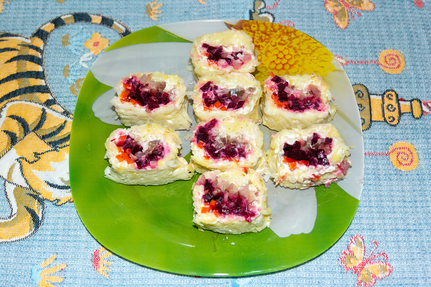 На бамбуковый коврик разложить равномерным слоем картофельное пюре. На пюре положить отварные овощи и порезанное яйцо. Сверху выдавить тонким слоем майонез. На майонез положить полоску ранее подготовленного филе сельди.