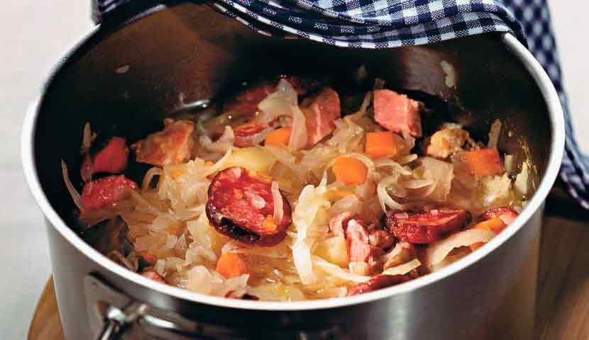 В горшочек выложить капусту, картофель и грибы. Влить приготовленный соус. Сардельки выложить сверху на овощи. Накрыть крышкой. Запекать в разогретой духовке в течение 20-30 минут.