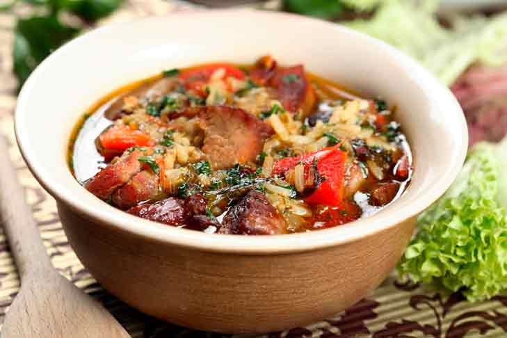 Содержимое сковороды переложить в керамический горшочек. Добавить измельченный чеснок. Посолить. Поперчить. Залить бульоном. Запекать в течение 20-30 минут в духовке, разогретой до 200 градусов. Добавить подготовленный рис. Запекать в течение 15-20 минут в духовке, разогретой до 180 градусов.