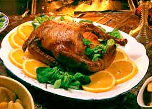 Подготовленной начинкой нафаршировать гуся. Отверстие зашить или скрепить шпажками. Положить на противень. Налить воду и куриный бульон.