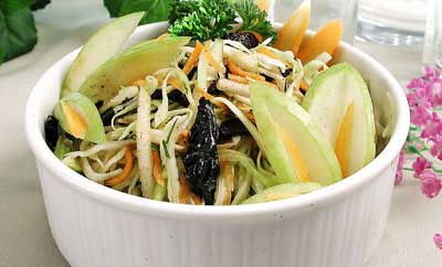 Капусту достать из холодильника и переложить в салатник. Добавить чернослив, орехи и мандарины. Заправить майонезом. Перемешать.