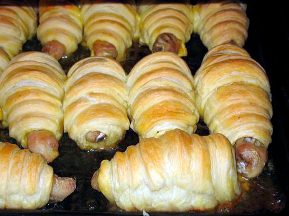 Готовое слоеное тесто раскатать полосками размером 30Х2 см. Полоски смазать кетчупом. В каждую полочку завернуть сосиску. Края скрепить зубочистками. Каждую сосиску смазать взбитым яйцом.