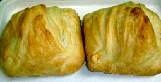 На противень, смазанный маслом, разложить половину подготовленных прямоугольников. В центр каждого положить начинку. Каждый оставшийся прямоугольник сложить пополам и, оставляя кайму 2,5 см., сделать вертикальные надрезы. Развернуть подготовленные кусочки теста. Положить их на прямоугольники с начинкой. Защипнуть края. Смазать взбитым яйцом. Посыпать тертым сыром "Пармезан".