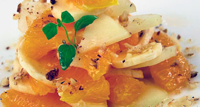 Ядро ореха измельчить, не превращая в крошку. Выложить в салатник. Апельсины помыть. Очистить от кожуры и пленок. Мякоть нарезать и выложить к орехам. Лимон обдать кипятком и выдавить сок в салатник. Добавить мед. Перемешать.