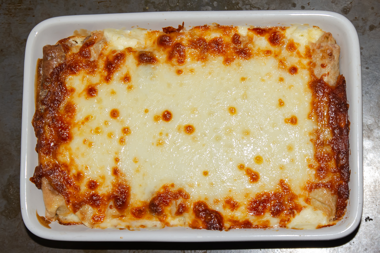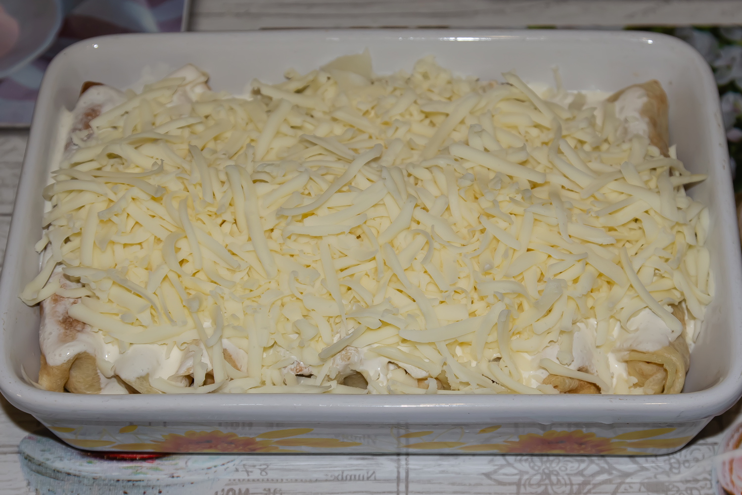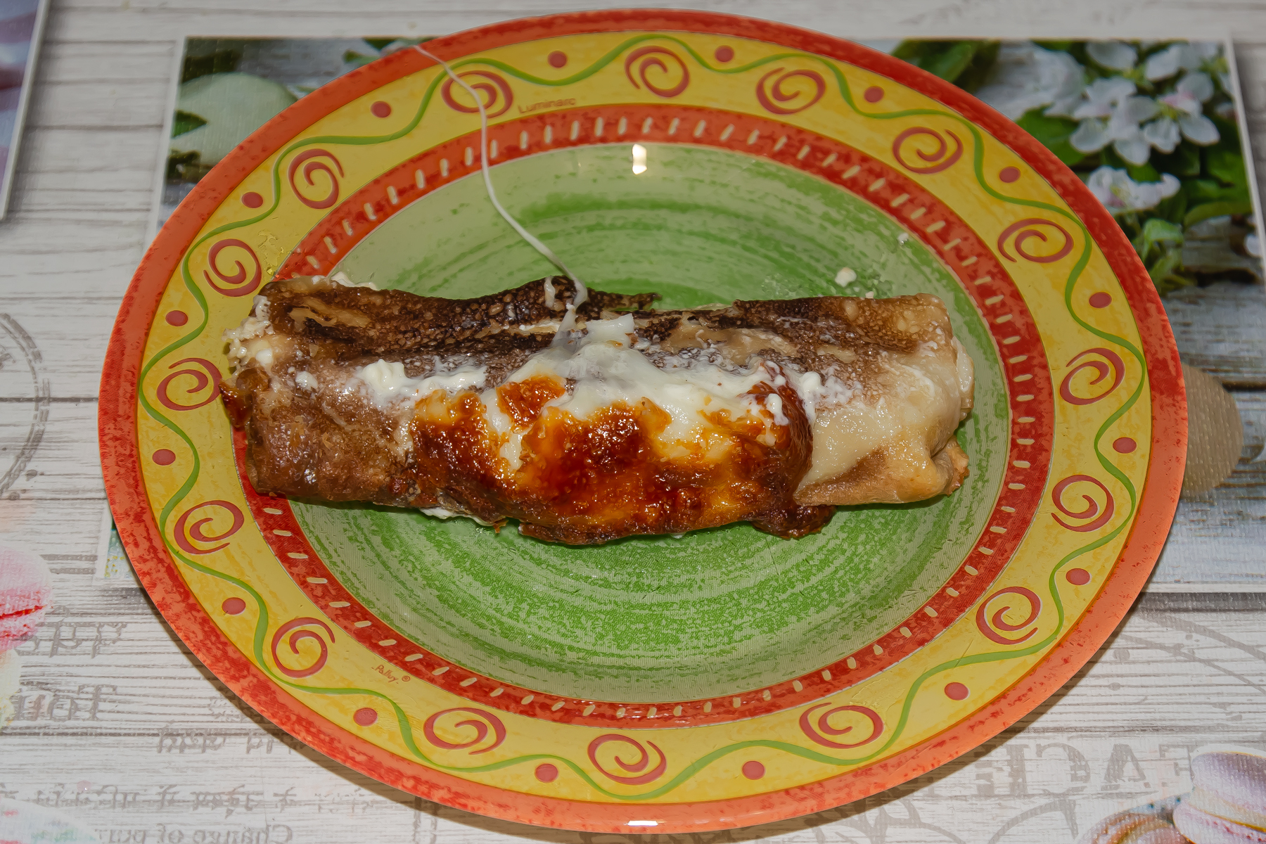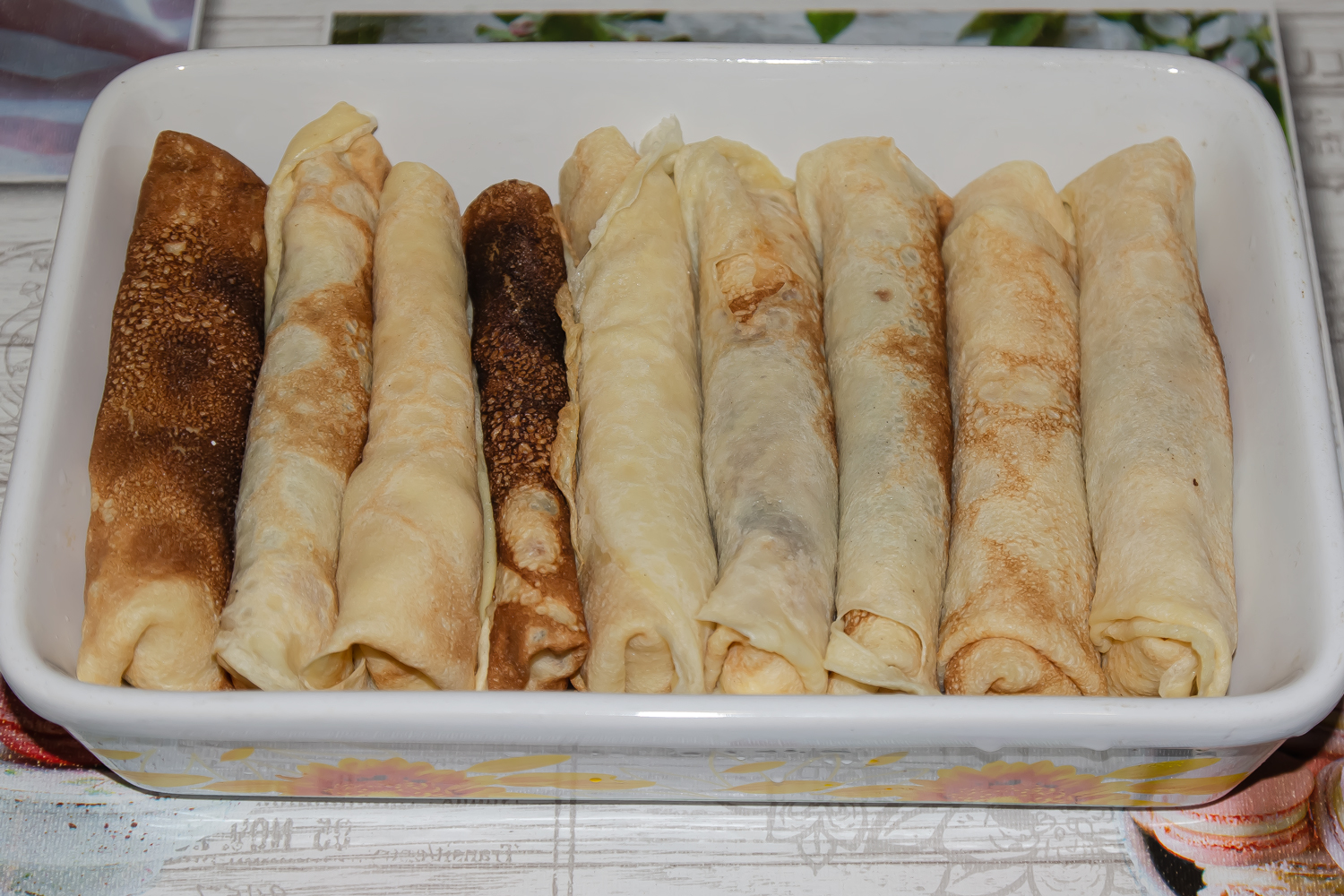 В центр каждого блина выложить начинку. Блины свернуть трубочкой и выложить в сковороду.