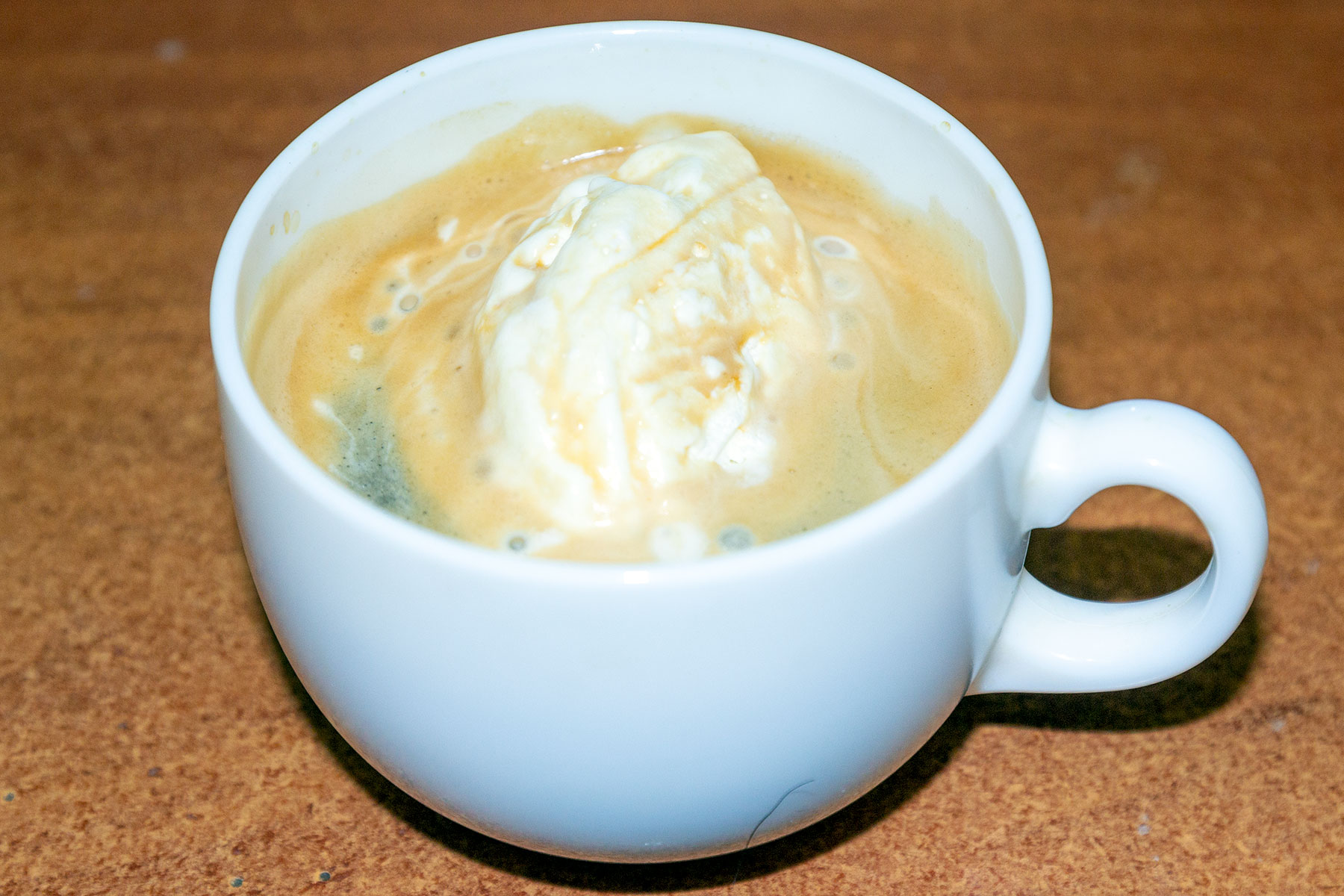 Процедить. Добавить в кофе сахар. Охладить. Кофе влить в бокал. Добавить мороженое и сразу же подавать на стол.