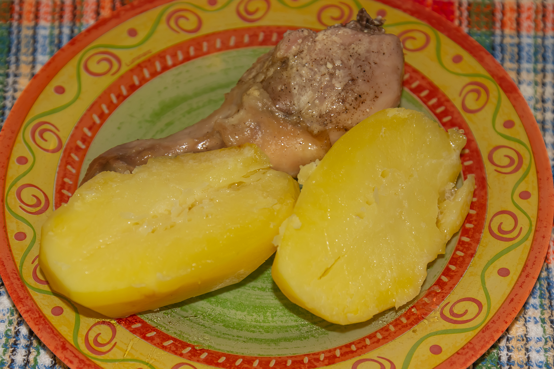 Курицу разложить по порциям. Картофель разрезать пополам. Посолить. На каждую половинку вложить небольшой кусочек сливочного масла.