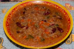 Рис промыть и выложить в сковороду. Влить бульон, перемешать и довести до кипения.