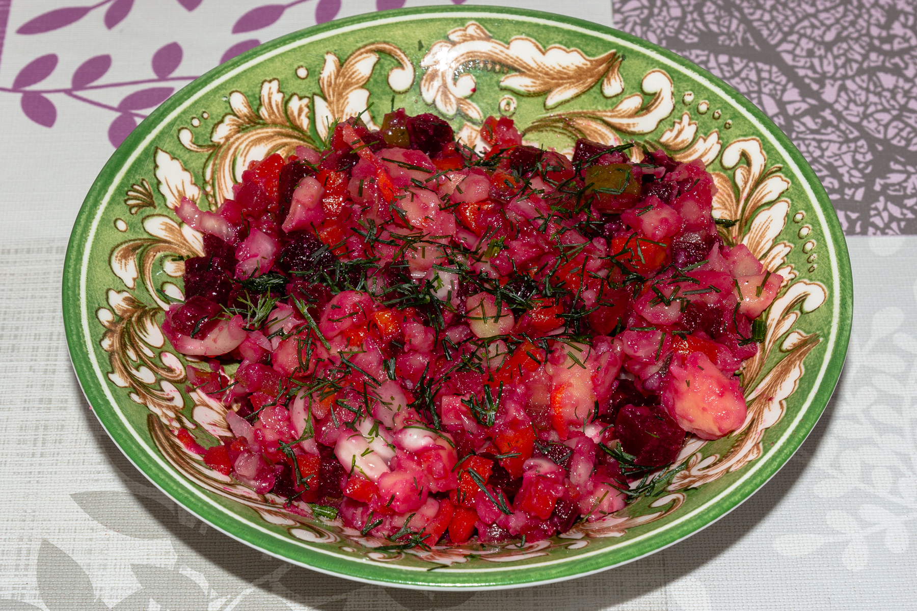 Картофель, свеклу и морковь отварить. Грибы и репчатый лук нарезать кубиками. Картофель, свеклу, огурец и морковь измельчить