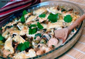 Шампиньоны вымыть, разрезать на четвертинки, сбрызнуть 1 ст. ложкой лимонного сока. Лук очистить и нарезать тонкими полукольцами.
