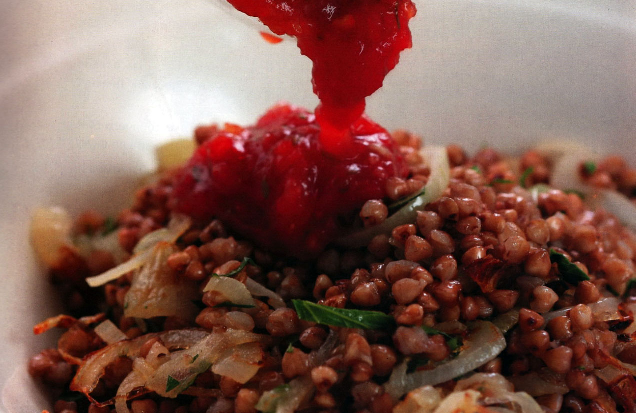 Выложить гречку в тарелку, аджику подать отдельно в соуснике.