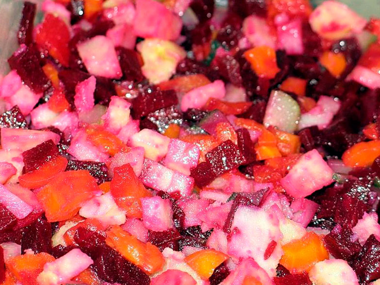 Капусту измельчить, яблоко натереть на крупной терке. Капусту и яблоко соединить, посолить, поперчить, посахарить и залить свекольным или лимонным соком. Картофель отварить и нарезать кубиками. Лук мелко нарезать. Всё соединить и заправить растительным маслом.