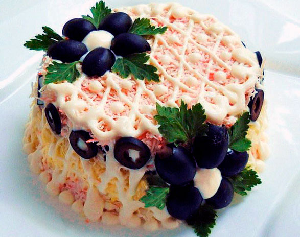 Яйца отварить вкрутую и натереть на крупной терке. Крабовые палочки мелко нарезать или натереть на терке. Чернослив помыть и нарезать.