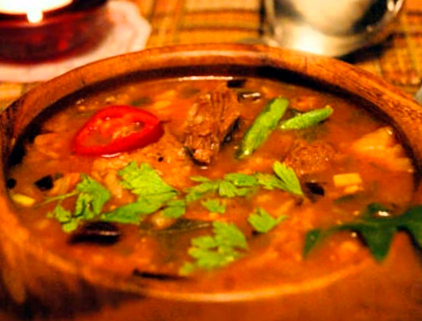 Мозговую кость помыть и положить в кастрюлю с водой. Кастрюлю поставить на разогретую плиту. Варить на умеренном огне в течение 1,5-2 часов, снимая образовавшуюся пенку. Свинину и говядину помыть, нарезать кубиками и добавить в бульон. Варить в течение 10-15 минут. Посолить. Добавить перец чили, черный перец горошком, промытый рис, измельченный репчатый лук, томатную пасту и лавровый лист. Дать закипеть. Убавить огонь. Варить до тех пор, пока рис не будет готов. Добавить измельченный чеснок. Отключить плиту. Дать супу настояться.