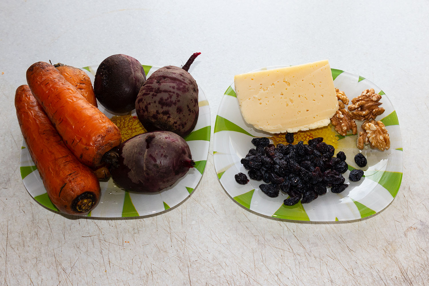 Изюм распарить. Свеклу отварить, почистить и натереть. Сыр натереть.