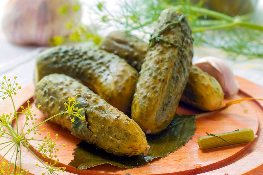 В чистую глубокую глиняную емкость (изнутри обливную) положите листья сельдерея, петрушки и базилика, острый перец и дольки чеснока. На них поместите огурцы вперемежку с зеленью укропа. Залейте горячим рассолом, накройте листьями винограда и оставьте на 3 дня при комнатной температуре. Переставьте емкость в погреб. Через неделю подавайте огурчики на стол.
