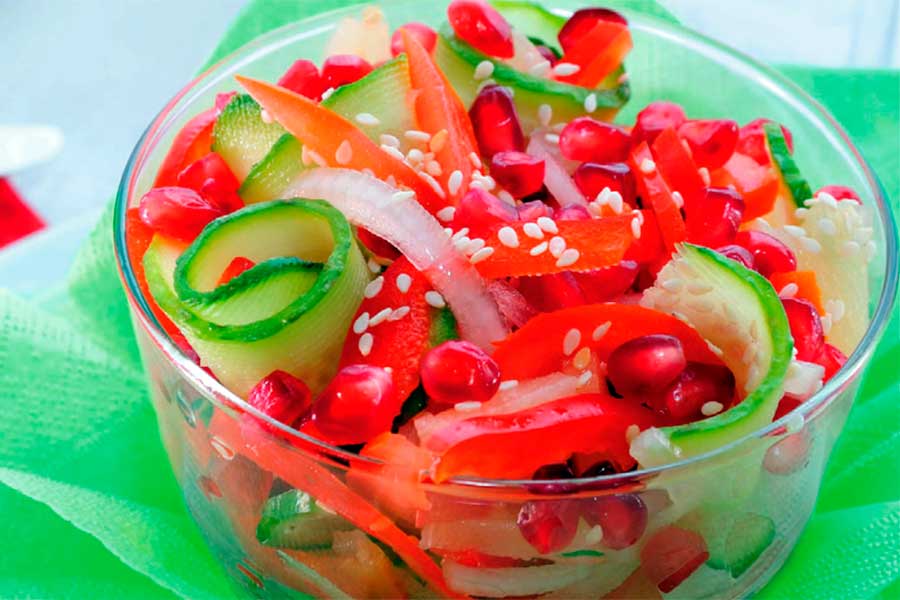 Огурец нарежьте тонкими кружочками или полосками. Болгарский перец очистите от семян и нарежьте соломкой. Луковицу почистите и нарежьте полукольцами. Смешайте огурец, перец, лук и семена граната. Слегка посолите. Выложите в салатник. Сбрызните винным уксусом и посыпьте сверху семенами кунжута.