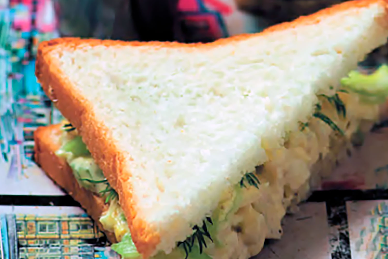 Яйца очистить и размять вилкой. Сельдерей нарезать ломтиками, зелень измельчить. Смешать яйца, сельдерей, зелень, майонез. Посолить и поперчить. Намазать яичный салат на 4 ломтика хлеба и накрыть остальными кусочками хлеба. Разрезать сэндвичи пополам на треугольники.