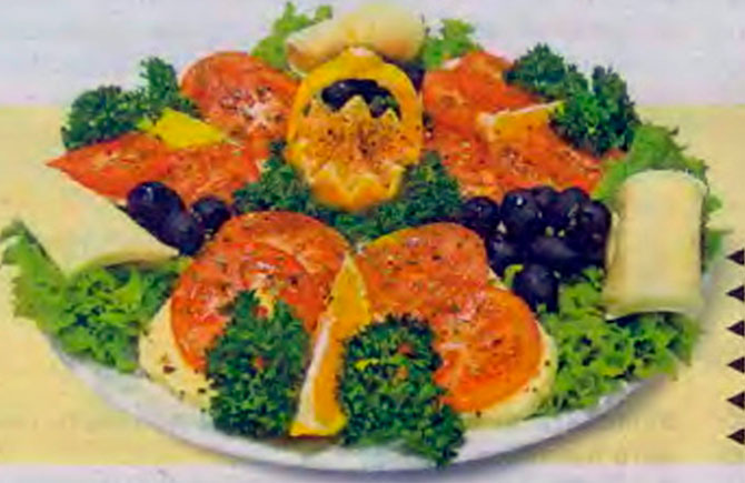 Помидоры и сыр нарезаются кружочками: на ломтик помидора укладывается кусочек сыра, посыпается солью, перцем, орегано, поливается оливковым маслом.