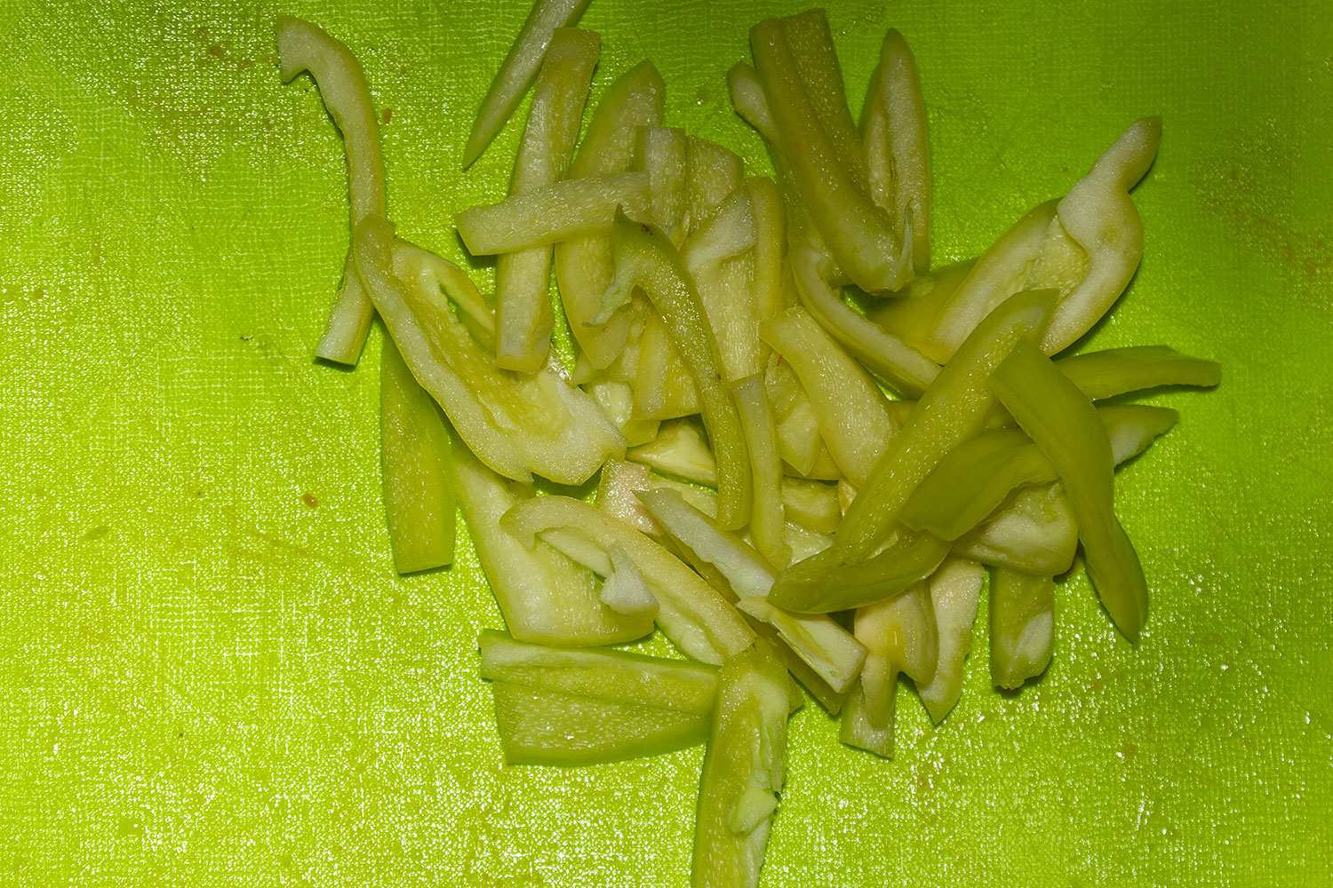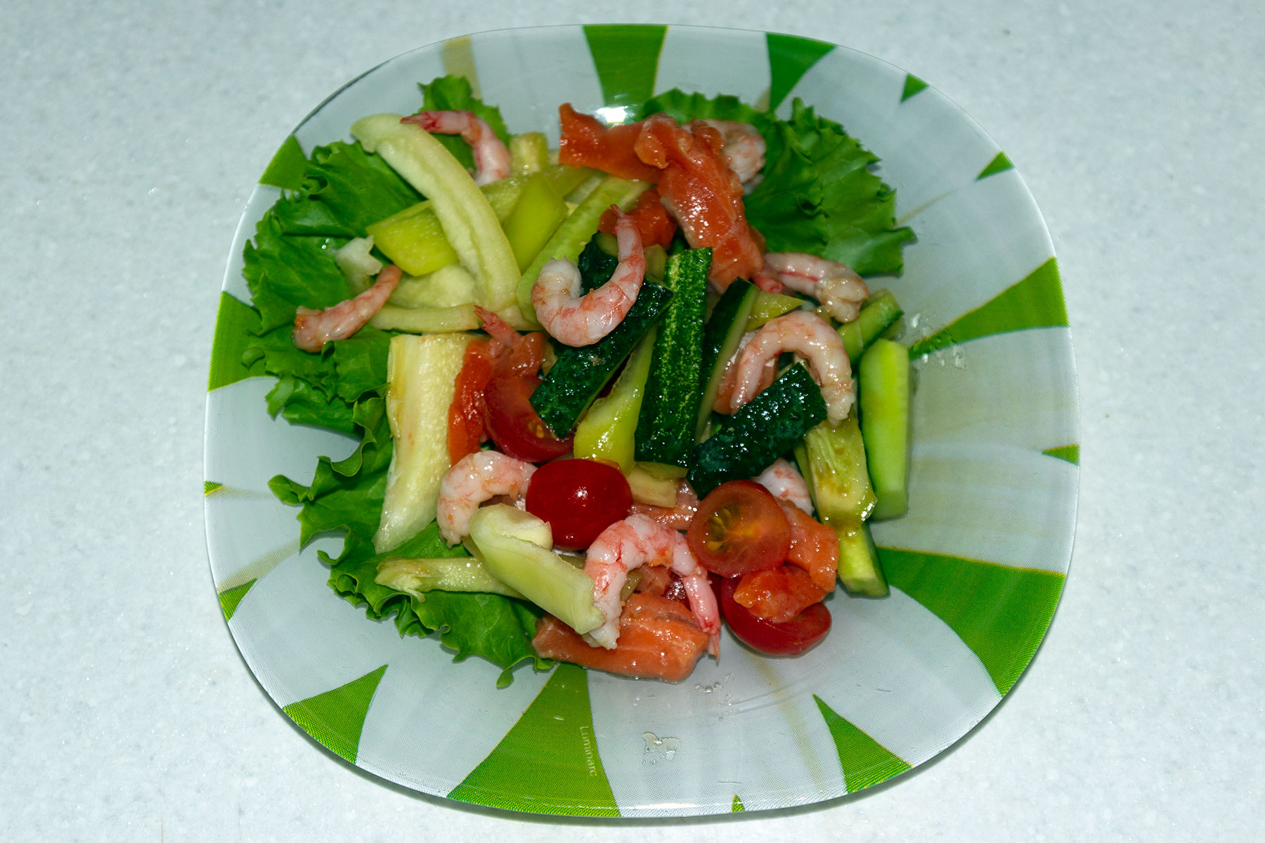 Замороженные креветки отваривают в подсоленной воде и очищают. Слабосоленое филе семги, помидоры, огурцы, перец нарезаем соломкой.