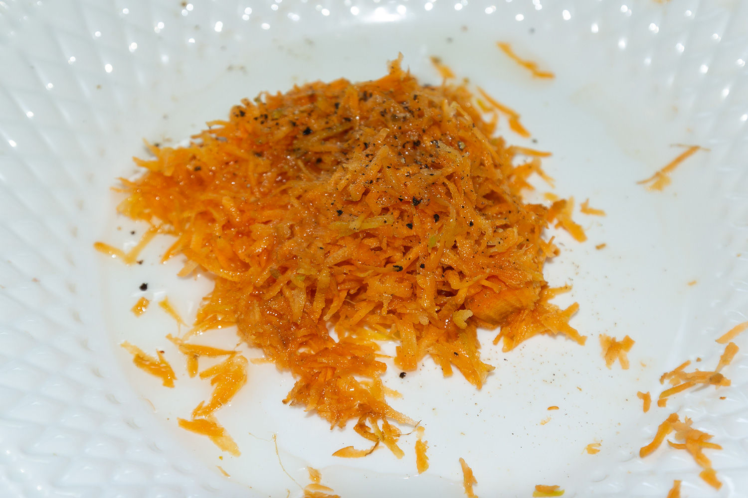 Свежую морковь натереть на мелкой терке. Посолить, поперчить, полить растительным маслом. Перемешать, оставить на 10 минут.